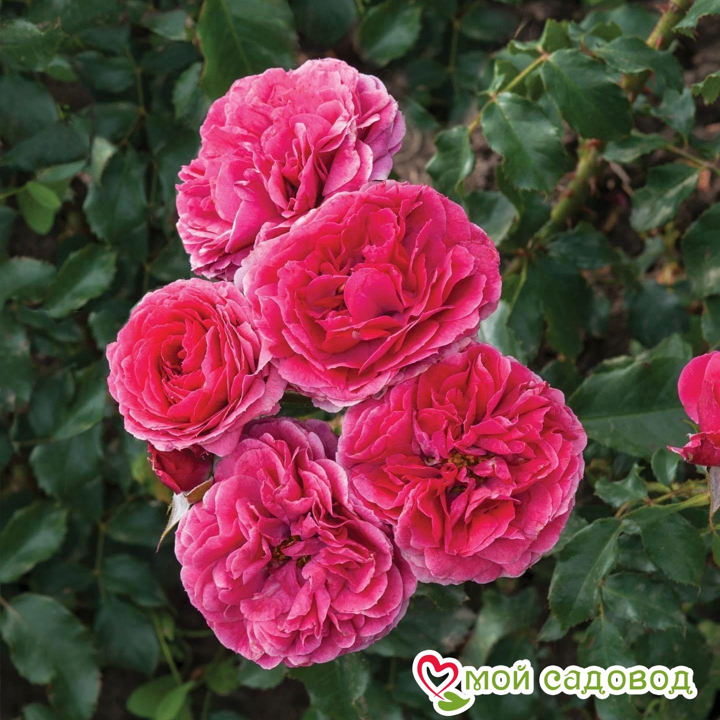 Цветки диаметром 6-7 см, махровые, тёмно-розовые со смешанными светло-сиреневыми и карминовыми оттенками, собраны в плотные соцветия, благодаря чему эта роза имеет вид букета.